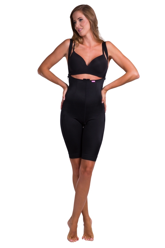 Dámské body - s 3/4 rukávem a nohavičkami pod kolena, s tvarovanými košíčky, předním zapínáním na zip a hygienickým otvorem
