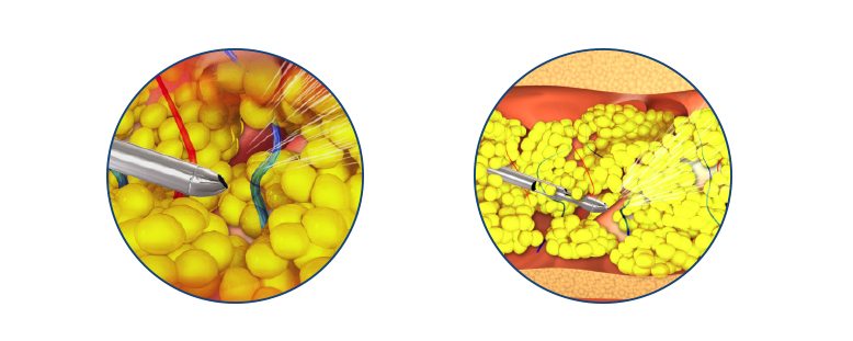Vodní paprsek uvolňuje tukové buňky z tkáňových struktur. Tukové buňky a vyplachovací roztok jsou současně odsávány odsávací kanylou a odcházejí odsávací hadicí do odsávacího kontejneru. Odsávání zajišťuje integrovaný odsávací systém.
